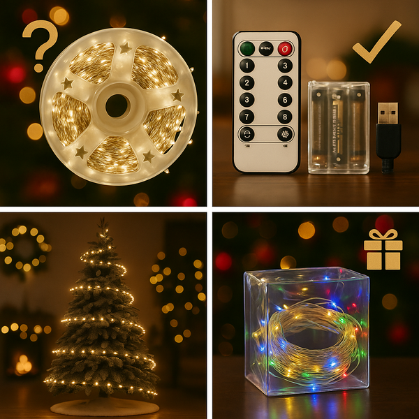 Observa el destello continuo: luces nítidas, sin parpadeos, que realzan el pino y las decoraciones, creando profundidad y bokeh perfecto para fotos y videos. Elige tu metraje y logra un ambiente realmente navideño en segundos.