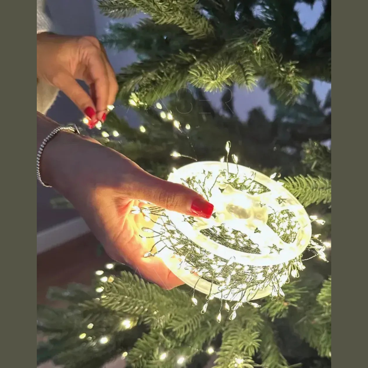 Con nuestras luces puedes tenerla, dale la vuelta al pino con una sola tira y deja anillitos parejos de arriba a abajo. Queda limpio, moderno y se ve brutal en fotos y video.