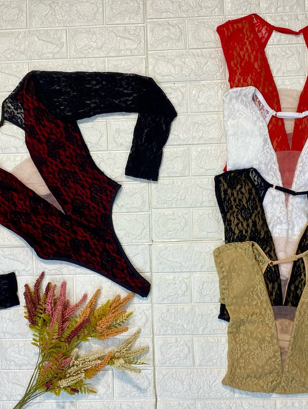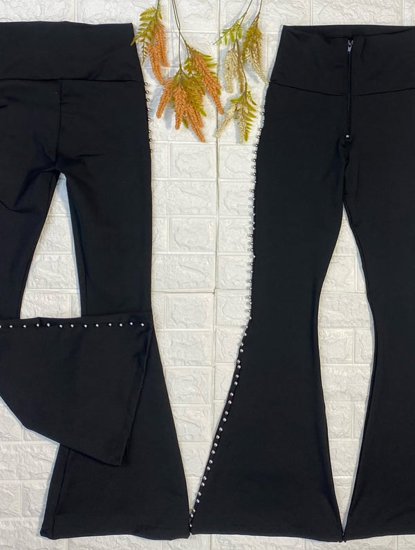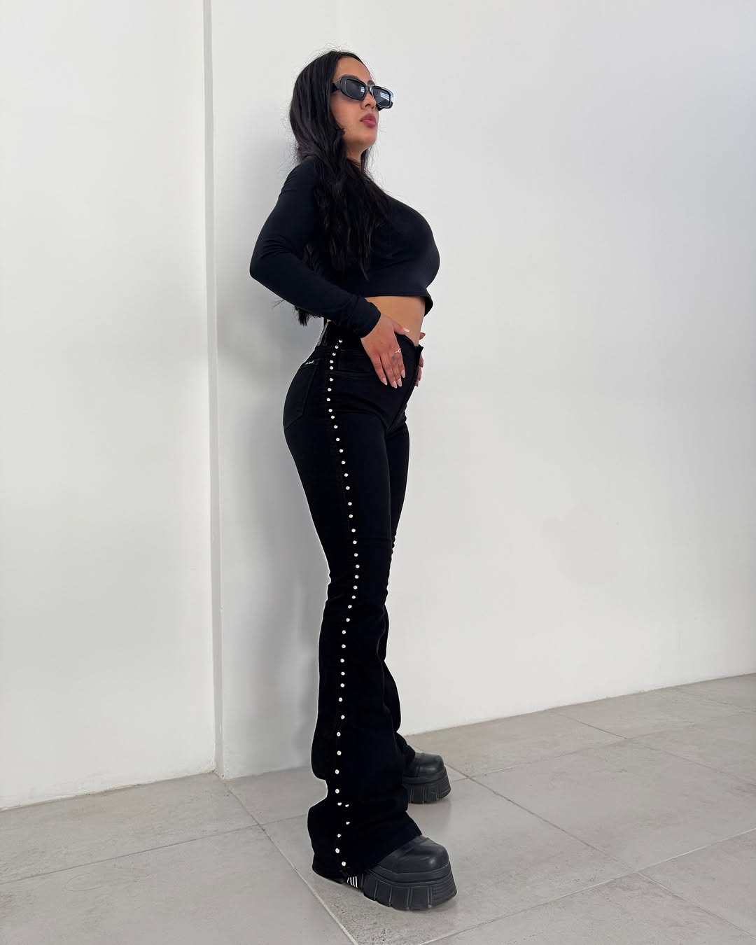 Body de encaje y pantalón acampanado con perlas laterales: Elegancia, sensualidad y comodidad en una sola prenda.