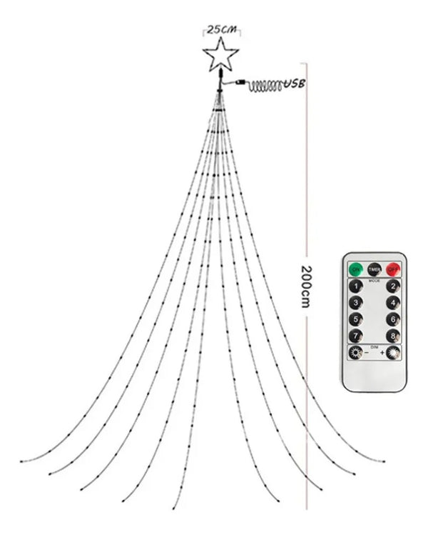 Una estrella con 9 tiras de 2 metros de caída. Se alimenta por USB y trae control remoto para cambiar modos, activar temporizador y regular el brillo.