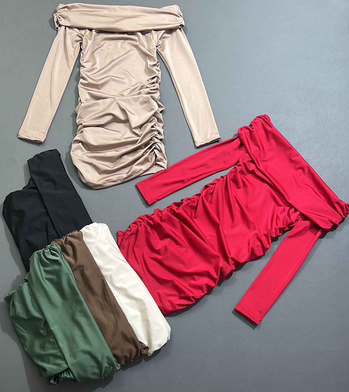 Este vestido ajustado con escote bandeja (off-shoulder) y fruncidos laterales está diseñado para estilizar tu figura y resaltar tu elegancia. Un diseño versátil que combina comodidad y sensualidad, perfecto para una cita, una salida con amigas o un evento especial.